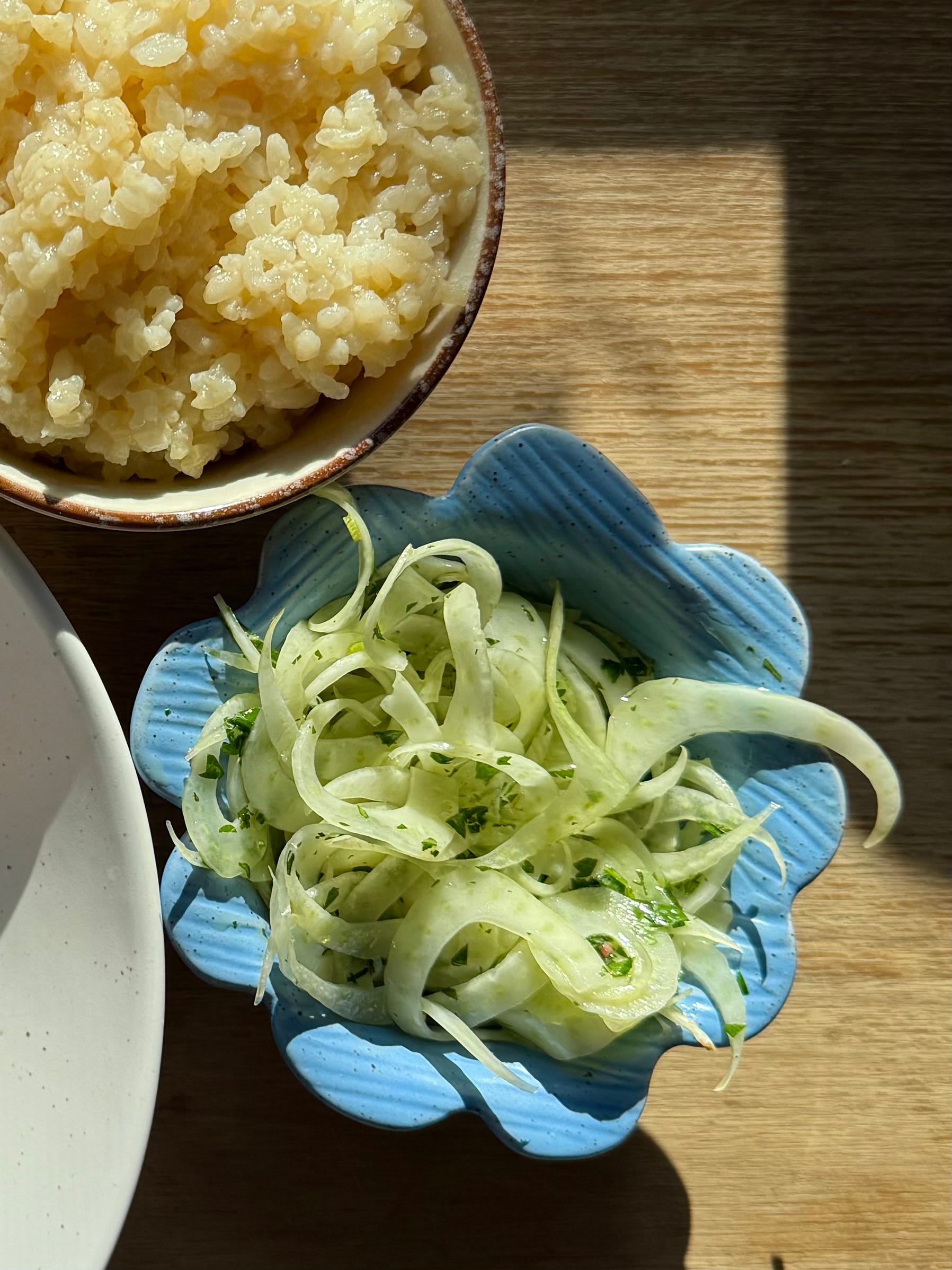 Today’s menu highlights ginger, fennel, daikon radish, lemon, lime, and pear. I went back and forth on the direction I wanted to take this month—it was originally going to be something heartier. But after the holidays and spending time back in my kitchen, I found myself craving food that felt lighter and fresher. This menu still leans into seasonal produce, warmth, and nourishment, while keeping everything bright and refreshing.