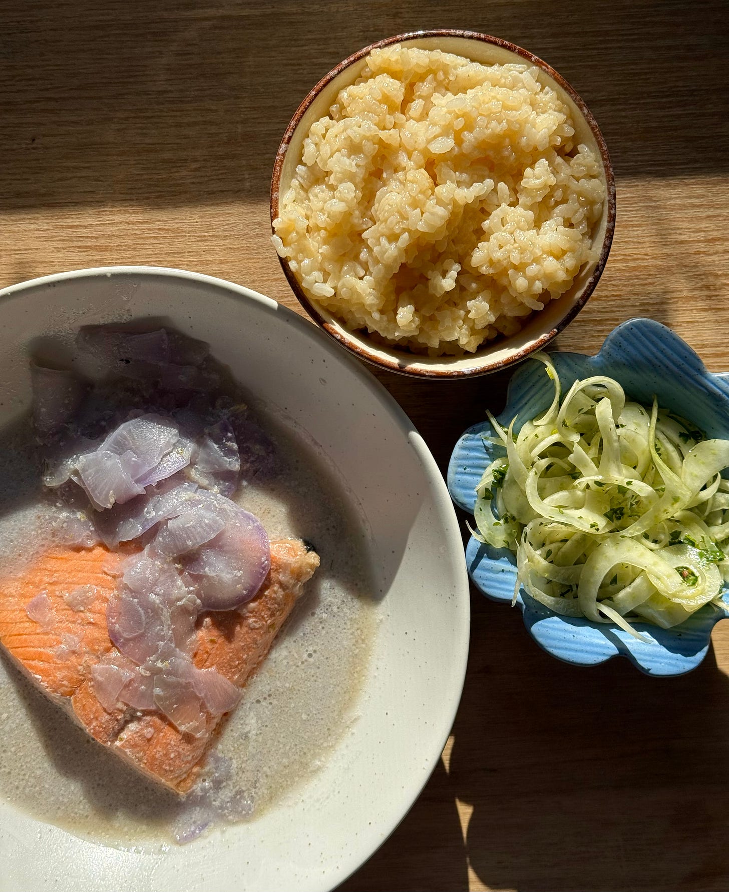 Ginger-Lemongrass Tea, Herbaceous Fennel Slaw, Creamy Coconut Poached Salmon with Daikon Radish & Miso Butter Rice, Steamed Pear with Cardamom Crumble