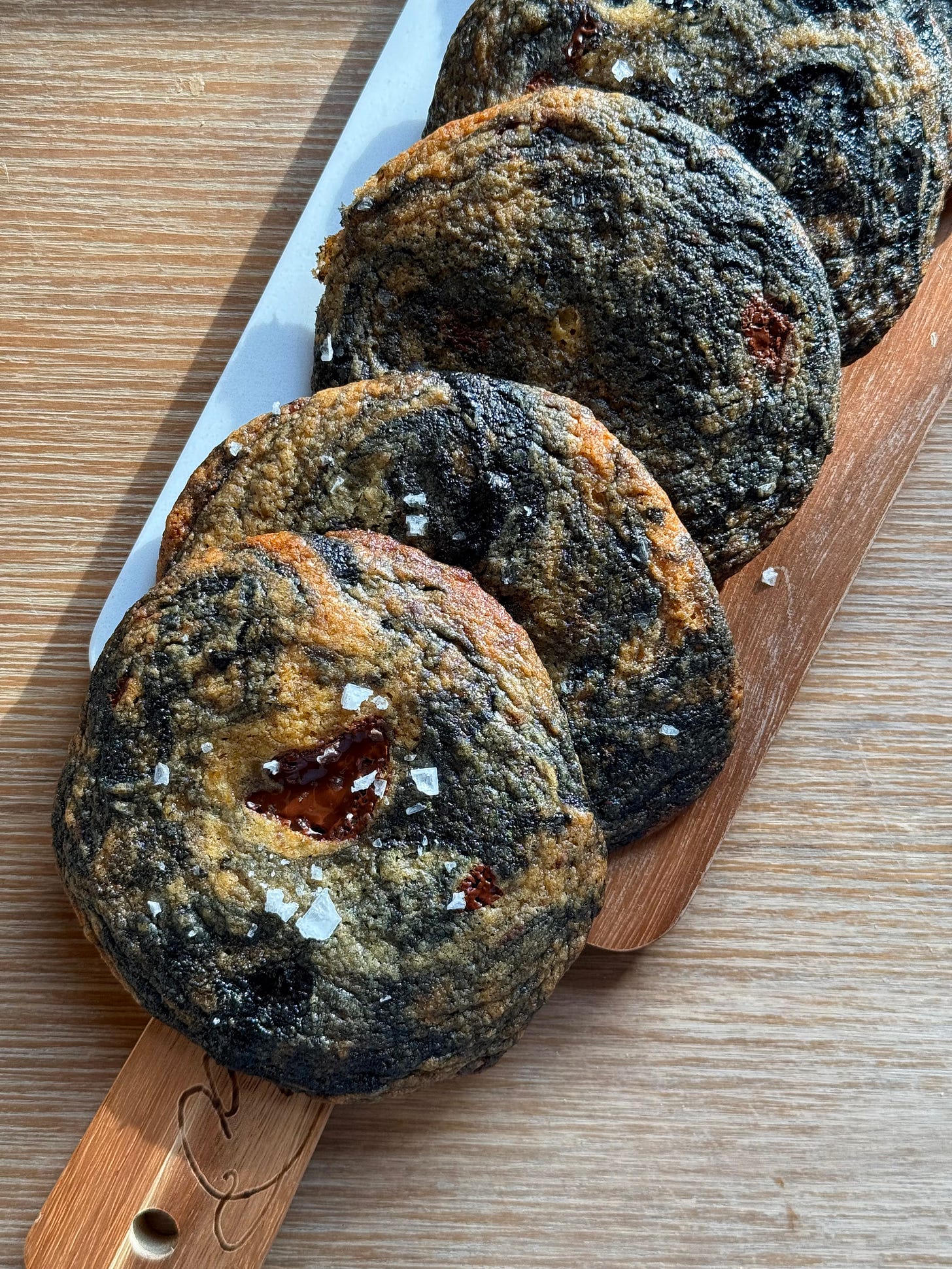 So I went to work on a spiced miso chocolate chunk cookie, adding cardamom & ginger, I made so many batches and it just was not right. I settled on making a plain old miso chocolate chunk cookie…as basic as it was…and then at the last minute I decided to dump in some of my black sesame paste (why hadn’t I thought of that earlier???) all the sudden….it was perfect. My two favorite things right now, my two hyper-fixations, made magic. AND I AM SO EXCITED TO SHARE WITH YOU!!!!