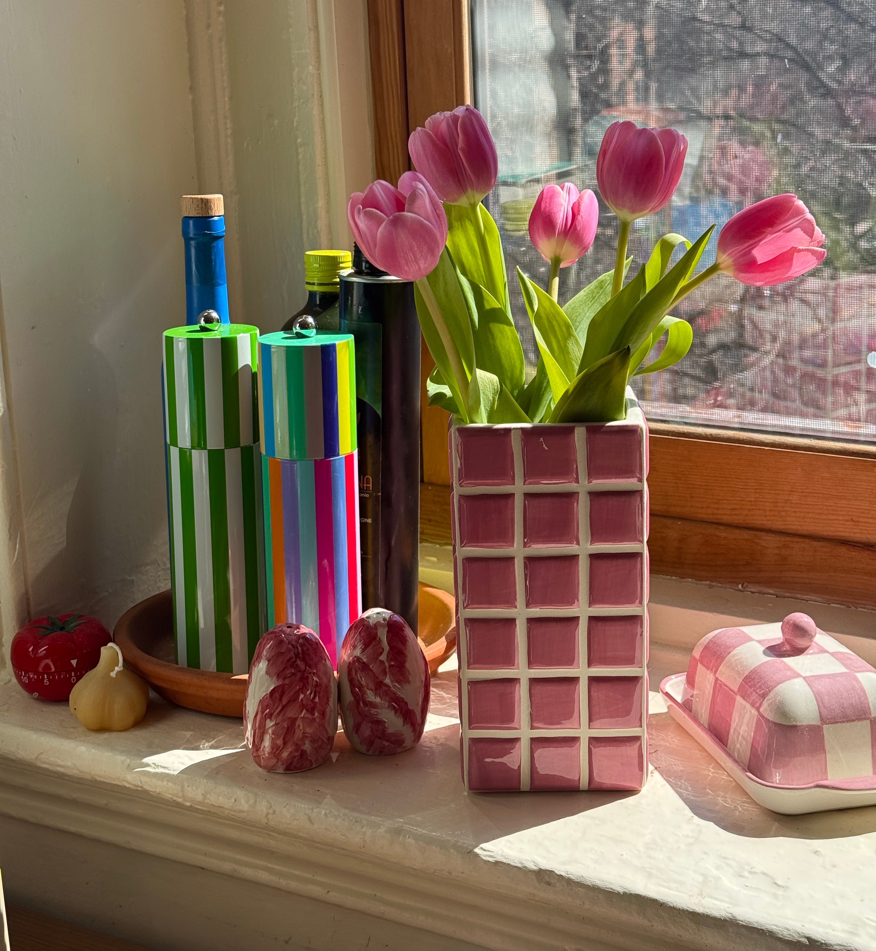 Color is an instant mood booster. When I think of spring, I think of all the colorful flowers blooming. This week at the farmers market I got some bright pink tulips and put them in my pink vase to fill my home with spring color! I also have been wearing more colors lately. Brightening out surroundings brings more life into our home!